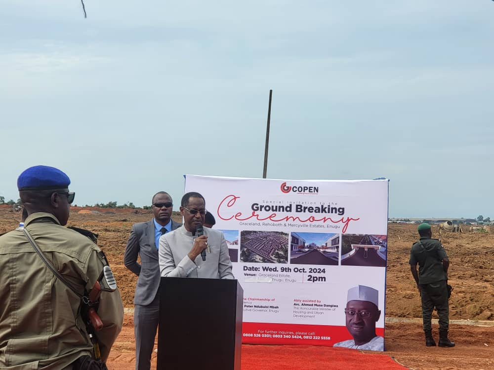 Enugu, 9th October 2024 – The Honourable Minister of Housing and Urban Development, Arc. Ahmed Musa Dangiwa has today, 9th October 2024, performed the groundbreaking for 10,000 housing units in Enugu State. The flag-off, which had the attendance of the Executive Governor of Enugu State, Dr. Peter Mbah, is for Graceland Estate being developed by COPEN Group under the broad framework of the Renewed Hope Housing Programme.