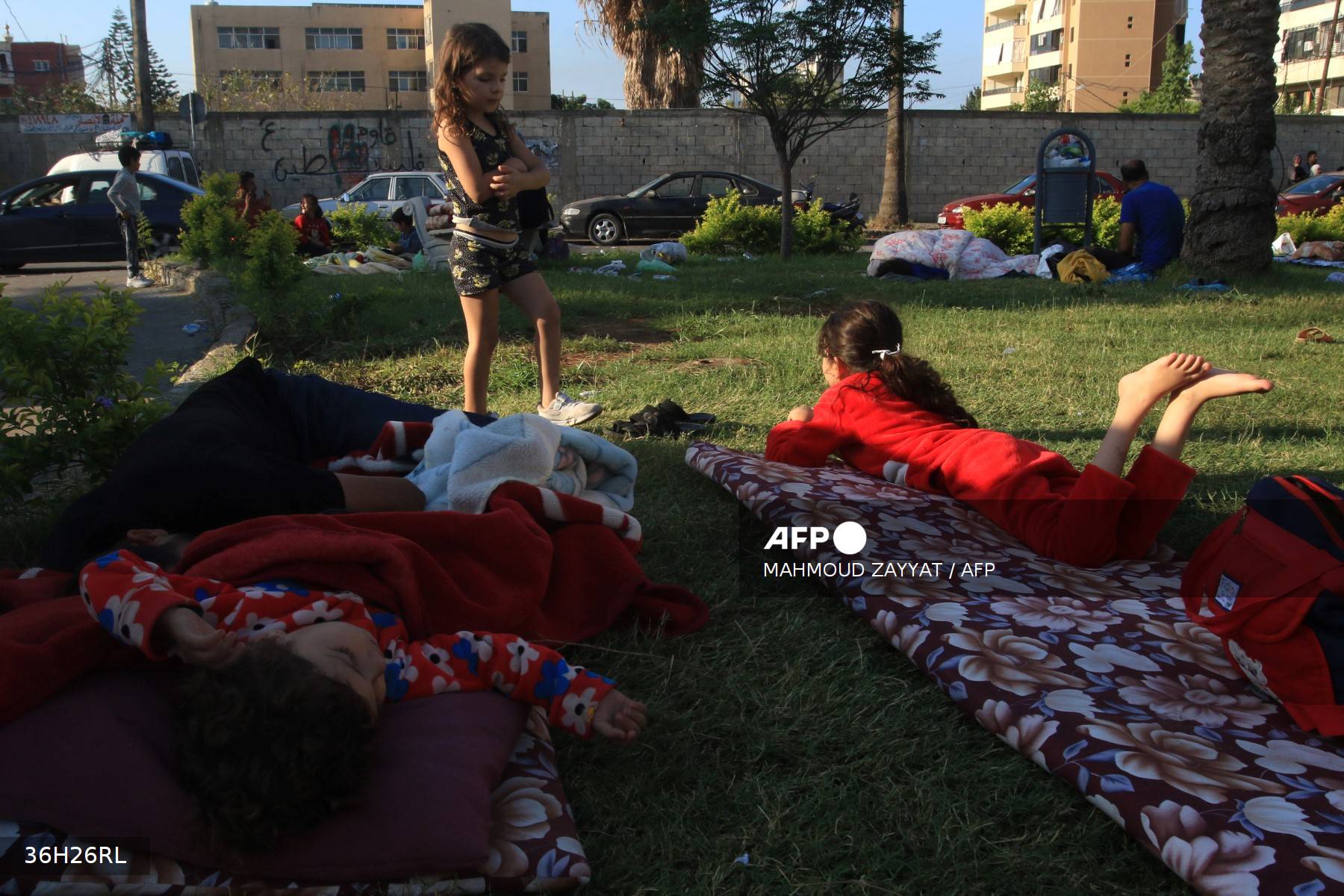 Children, who fled with their families from their homes in southern Lebanon, spend the night at a park in the Lebanese city of Sidon on September 24, 2024. - Israel announced dozens of new air strikes on Hezbollah strongholds in Lebanon on September 24, a day after 492 people, including 35 children, were killed in the deadliest bombardment since a devastating war in 2006. (Photo by Mahmoud ZAYYAT / AFP)