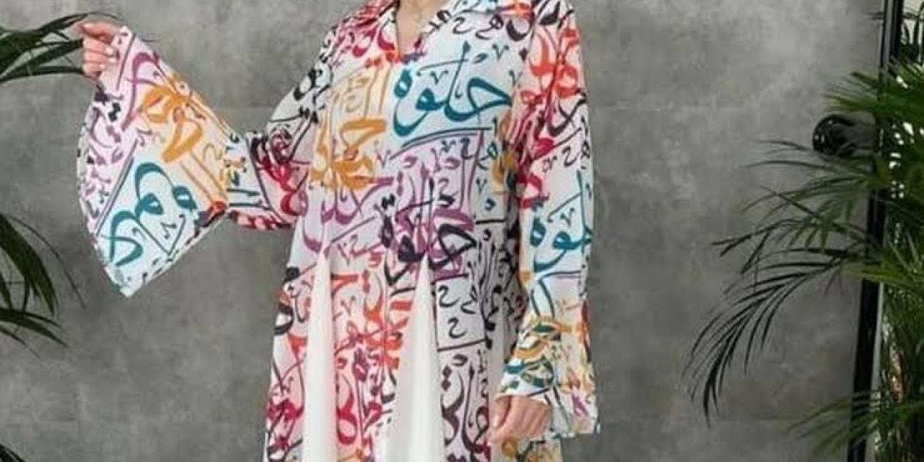 The dress has the word “Halwa” printed in Arabic letters on it, meaning sweet in Arabic.
