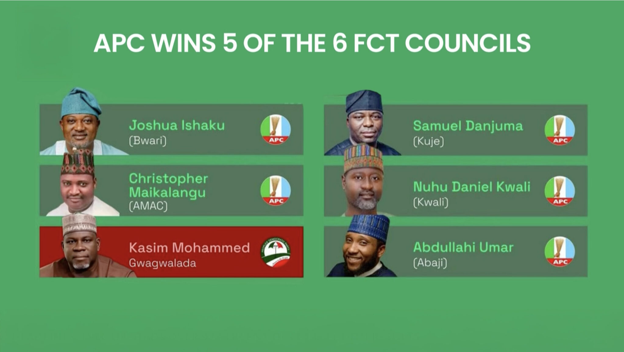 In Kuje Area Council, APC candidate Danjuma Shekwolo won the chairmanship election with 17,269 votes.